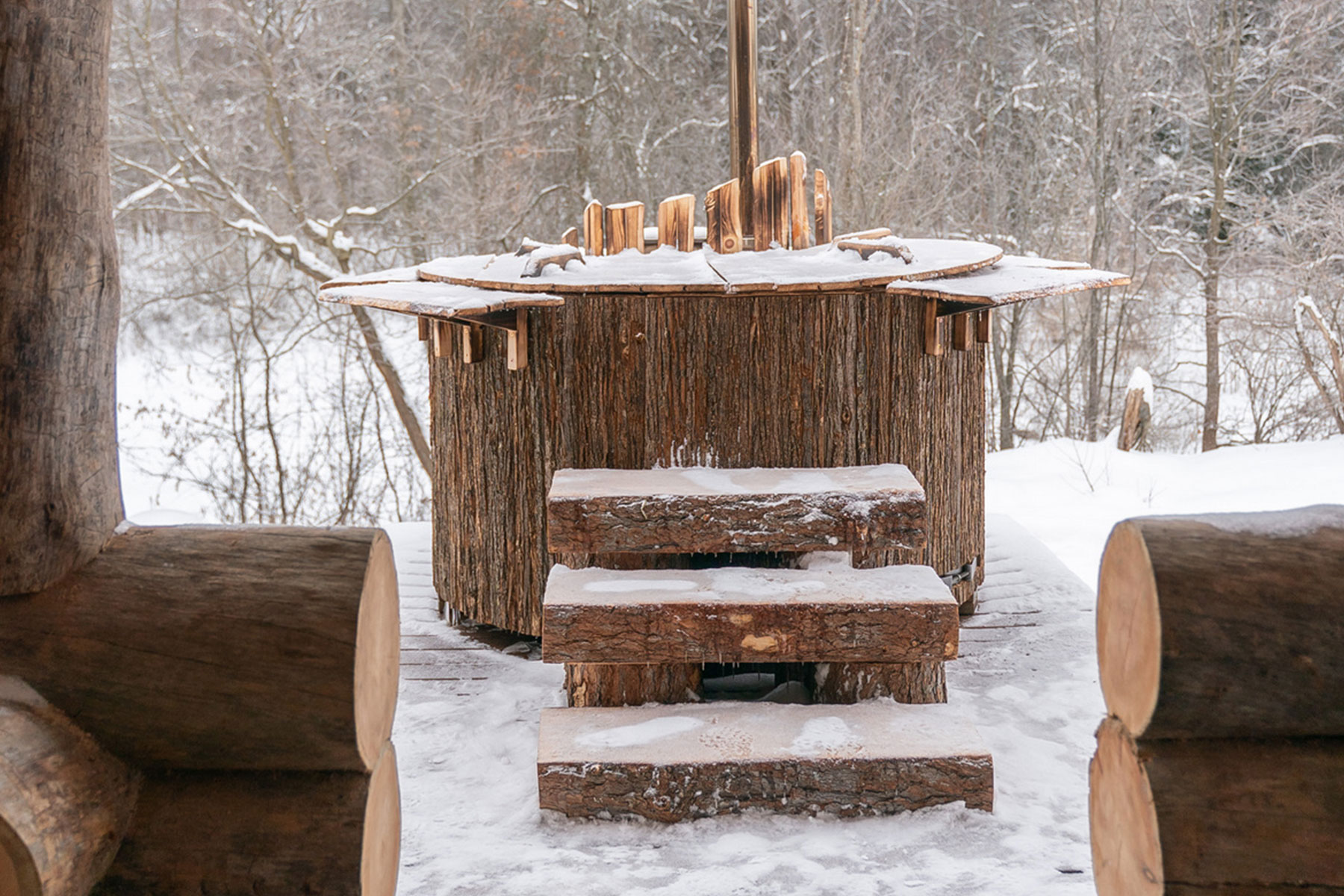 Комплекс рассчитан на компанию до 10 человек, объединяя парную, зону отдыха и купель. Отличительная черта — использование карельской сосны КЕЛО, которая создаёт идеальный микроклимат благодаря сбалансированной влажности и насыщает воздух целебным хвойным ароматом. Общая площадь в 105 м² позволяет комфортно разместиться как шумной компании, так и тем, кто ищет уединения.